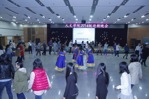 之后是集体游戏“七拼八凑”与“一块五”,为了凑够游戏要求的东西,同学们满场狂奔逢人便问只为一张一毛纸币;为了不被淘汰,参与者抱团作战只为凑够“一块五”。趣味与反应速度的比拼让同学们笑声不断。欢腾过后是暂时安静地欣赏:张馨月的二胡独奏《战马奔腾》体现出新生们的多才多艺;五位藏族金花的藏族歌舞表演则为同学们带来雪域风情;倪佳晨、张远哲、郭光勇、王宇昕四位大二同学组成的“人文四杰”为师弟师妹们带来原创小品《杀死比尔》,现场掌声不断。更有全场一起随着藏族姑娘跳起的欢快锅庄舞,感受了一把藏族同胞的民族特色。随后是梅3123和兰1104两个宿舍的同学们表演的歌曲合唱《今天你要嫁给我》和《私奔到月球》,两两搭档的有趣互动让同学们兴奋不已,鼓足勇气又略带羞涩,带来了浓浓的暖意。