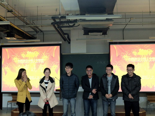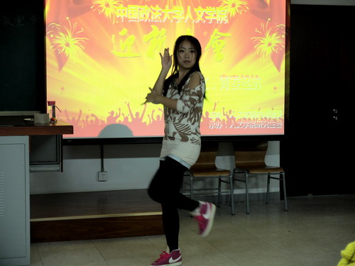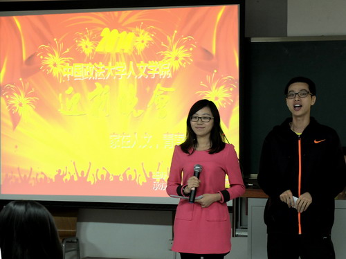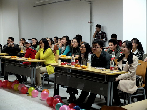 晚会在节目和游戏穿插进行中展开。首先,纪婉嫕和刘怡春同学演唱了一曲深情的德语歌,随后段俊清同学为大家带来歌曲《春暖花开》,悠扬的旋律,使每个同学都深深的陶醉在歌声中。接下来进入第一个游戏环节——萝卜蹲,杨老师作为队员也参与其中,High翻了全场。接着,黄果同学为我们表演了一场少女时代的动感舞蹈,点燃了全场的气氛,迎来阵阵喝彩。之后由魏昕同学和苏慧群同学组成的苏昕组合给大家带来《你被写在我的歌里》,在第二个游戏环节——顶橘子中,被首先淘汰的同学接受了学大猩猩的惩罚措施,惟妙惟肖,引来笑声阵阵。冯信兴、郭威代表男同学们进行了歌曲串烧。接着,晚会就进入了最后一个游戏环节——梅花开,现场所有同学都参与其中,整个教室充满了欢声笑语。