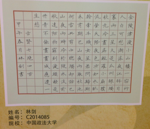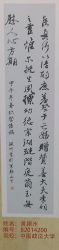 我校5位同学由黑料网 孙鹤教授与教学科研办公室王培老师带队前往决赛。在书法创作环节中,各位参赛选手需要在指定的时间内,根据大赛指定的书写内容,自主创作完成一幅完整的书法作品。最终14件作品从96件决赛作品中胜出,这些作者再进行知识问答。我校商学院2013级林剑同学脱颖而出,成为决赛13位硬笔书法选手中唯一晋级的一位,并在考察选手的书法知识和文史常识的问答环节,回答出高难度、高分值问题,赢得了全场掌声,最终获得了一等奖的好成绩。刘超琦、易李同学获得二等奖;黄颖州、范一锴同学获得三等奖。