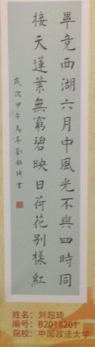 由北京市教委组织、首都师范大学承办的北京市大学生书法大赛第三届比赛于2014年6月8日圆满落幕,我校五位选手进入决赛,最终以一等奖1名、二等奖2名、三等奖2名的优异成绩载誉而归。