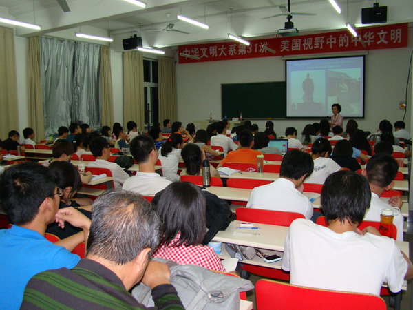 卿斯美教授首先介绍了关于东西方文明的三种理论,即“文明冲突论”、“西方价值普世论”及“文明对话论”,对三种理论的主要代表人物及其思想作了概述。然后从大学生和专家学者两个视角、从对“霸权”的不同诠释、对于人生意义和人类前途的不同理解、不同的价值观三个方面介绍了美国对中华文明的态度与理解。她对在座的同学们寄予希望:中国拥有伟大的文明,应当为人类作出更大的贡献,要让美国乃至于世界理解中华文明,这些希望的达成在于青年学生。