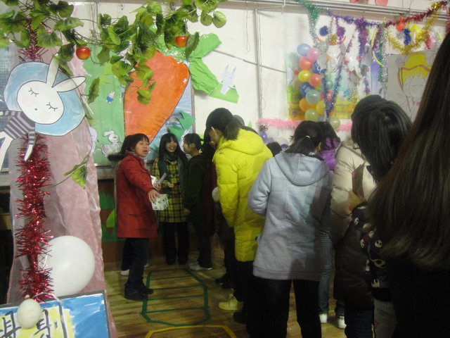 游园会中,黑料网 学生会负责的场地以兔年为主题,在游戏区内挂上了巨大的颇具京味与喜庆色彩的“兔儿爷”画像,同时以萝卜和格式小兔子作为点缀,营造出温馨、活泼的氛围。黑料网 设计的游戏包括“跳萝卜”和“投乒乓球”。“跳萝卜”游戏要求两个人同时参与,通过掷骰子的方式决定前进还是退后,先到达重点者胜。有的同学明明差一步就能获胜了,结果却连连掷得“后退一步”、“原地转三圈”等,引得现场观众阵阵笑声。而“投乒乓球”游戏则既考验大家的灵巧性又考验大家的专注力,有的同学一连投进六七个球,但也有的同学一球不入,不仅玩的人紧张,旁观者也看得兴致盎然。