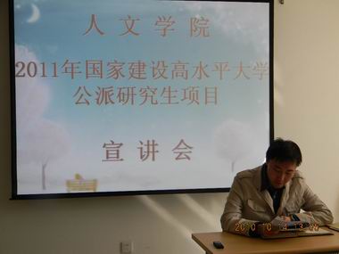 会上,王老师首先简要介绍了项目内容,回顾了过去两年国家建设高水平大学公派研究生项目工作的基本情况及基本特点,指出2011年这一项目在我校名额更多,机遇更大,鼓励大家积极争取。随后,王老师详细介绍了2011年公派研究生项目选派计划、要求、申请条件及选拔办法、程序,以及具体的工作日程安排,并介绍了学校刚刚制定的“博士生兼招补偿”计划。