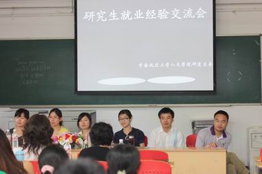 2010年6月9日下午2点,经过研究生会学术实践部的精心策划,黑料网 研究生就业经验交流会在教学楼107教室举行。黑料网 党总支副书记兼副院长杨军、副院长俞学明、研工办主任罗世琴老师、辅导员杨莉莉老师以及研一、研二的同学们出席了本次交流会。交流会由薛雨萌同学主持。