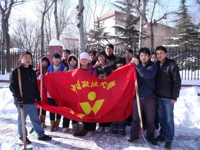 2010年1月3日,北京迎来了近40年来最大的一场雪。法大校园也被厚厚的冰雪覆盖,给师生的出行带来了不便。在国防生同学的扫雪大行动之后,各学院的志愿者也加入了扫雪活动。