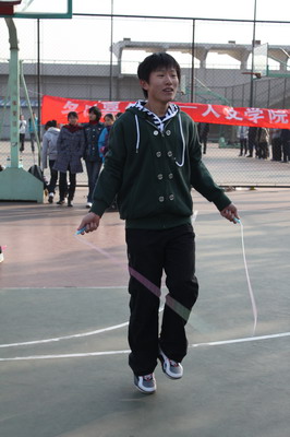 踢毽、跳绳、两人三足接力跑等比赛更是活泼有趣。参与跳绳比赛的各个寝室摩拳擦掌,一副自信的样子。裁判一声令下,选手们开始轻盈起跳。08级的张宇飞同学表现尤为突出,其他寝室都是六个人轮流上场各一分钟,他一个人代表全寝室一刻没停地跳了整整六分钟,一旁的人全都看得目瞪口呆。