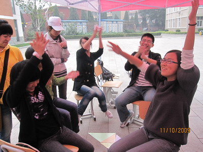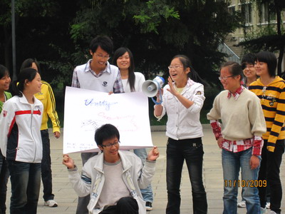 09级新生素质拓展活动在学生活动中心前展开了。本次活动的参加者主要是大一新生,并邀请了大二大三的同学来做嘉宾和评委,目的在于通过团体游戏丰富大学生生活,增进同学们团队合作意识。