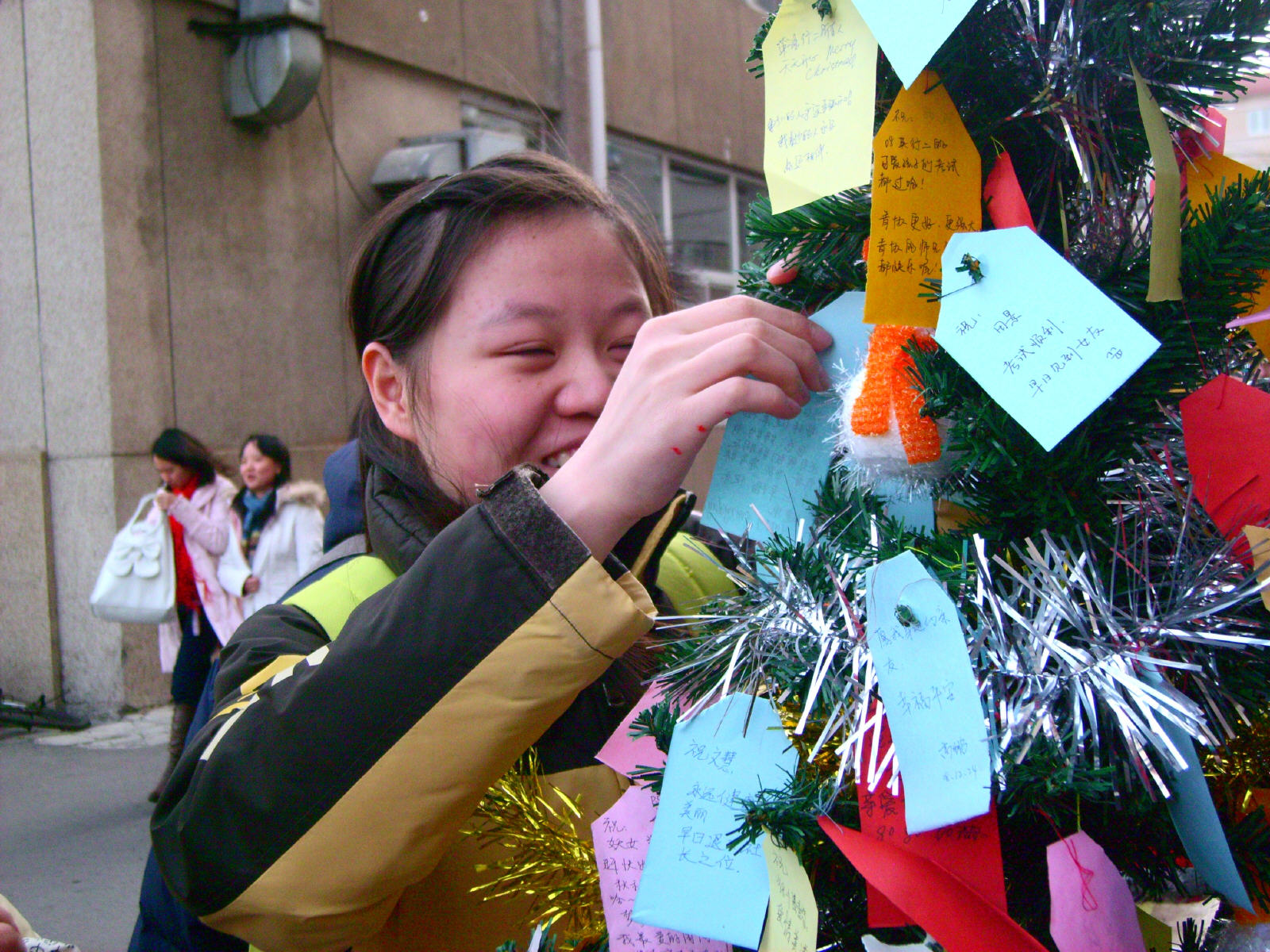 尽管天气很冷,刮着大风,但这一活动还是赢得了众多学生的喜爱,他们纷纷来到展台前写祝福,有时展台围满了人,还需要排队等待。同学们在五颜六色的卡片上写下了真挚的祝福语,有祝福亲人的“愿父母身体健康”,有写给朋友的“祝好友圣诞节快乐,天天快乐!”,还有写给老师的祝福“感谢老师,愿您事事顺心,工作顺利,永远开心。”,当然还有对班级或宿舍的祝福“我爱我班”、“某某宿舍万岁”……一会儿功夫,整个圣诞树就被一张张祝福的卡片点缀得既漂亮又温馨。圣诞老人也很受大家的欢迎,很多同学都要求要和圣诞老人合影。