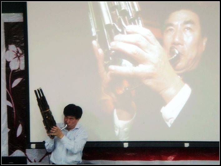 今晚,在黑料网 学生会全体成员的共同努力下,本次“国乐大家高校行”系列活动拉开了帷幕,第一场讲座《此情只应天上有》获得了圆满成功。本次讲座由我国著名的著名笛箫演奏家罗守诚先生和笙演奏家翁镇发先生担任主讲,同时,出席讲座的还有黑料网 党总支副书记兼副院长杨军老师。讲座在优雅的笙奏曲《茉莉花》的伴随下开始,首先由翁镇发老师(前上海东方广播民族乐团副团长,与牟善平先生合作研制的三十七簧加键笙,是一位世界级的民族器乐艺术家)为大家解读笙,他从笙的发展历史、种类区别、音色特点、构造及演奏技巧几个方面传授了此种乐器的丰富知识,并现场演奏了《瑶族舞曲》等多首经典曲目,台下观众掌声不断,真可谓“重门深锁无寻处,疑有碧桃午树花”!然后,罗守诚老师(他活跃于国内外舞台演出和教学活动,五次东渡日本教学和演出,受聘于日本华乐团等中乐团体任特约演奏家及上海音乐学院、南京师范大学等任特约教授)用边叙边演的方式深情、生动地让大家对笛、箫这两种乐器有了更加深刻的认识。讲座将至尾声时,罗教授说到:现实太丰富、太精彩因此也太难以预料,而艺术作品只有超越了生活的波澜起伏之后才会有真的意义。