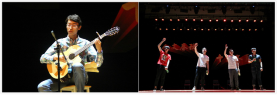 接下来,由陈海沂同学为大家带来舞蹈《点绛唇》。陈海沂身着长裙,手持铜镜,舞姿翩翩,一颦一笑,尽态极妍,充分展现少女的愁思与曼妙的姿态。由徐诺、刘星鼎、陈杰同学弹唱的《菊花台》,古韵的调子与现代的吉他相结合,带来的是超越古今的美,是视觉与内心的享受。古色古香延续,付鼎与黄静俭同学又带来了民乐合奏《渔舟唱晚》。刚开始,曲调清冷而悠长;忽的,曲调转而欢快,节奏也变得更加急促,又在急促后回归平静。二胡与古筝完美地结合,那调子仿佛诉说着“落霞与孤鹜齐飞,秋水共长天一色”的美景。
