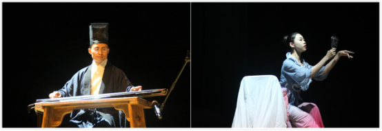 在阵阵掌声中,节目正式开始,第一个部分主题是是“人文路”。由肖磊老师和韩文娟同学带来的古琴和书法表演犹如一幅写意山水画。肖磊老师身着中华传统服饰,韩文娟同学则一袭白裙,娉婷袅袅。一人抚琴,一人写字,行云流水,台下的观众都凝神倾听,享受这安静的时光。曲毕,韩文娟向大家展示了她的书法作品——“诗肠酒骨,剑胆琴心”,师生二人向我们展示了中华文明的博大精深。