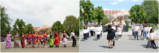 中华文明季的特色活动“中通快闪”也是精彩纷呈:短短十分钟,拓荒牛前的广场上一群人,呈现精彩的表演,发生炫彩灿烂的碰撞。4月22、23日中午12时许,4场由法学院、国际经济法学院、民商经济法学院、刑事司法学院部分同学带来的,民族舞蹈和民族音乐表演,宛如昙花一现,短暂的美感,却惊艳了每一个路过的人。他们歌唱,他们舞蹈,他们吹打,他们弹拨。巧笑倩兮,美目盼兮,气劘屈贾垒,目短曹刘墙。四场表演时间虽不长,但他们对于中华文化深湛的理解和大胆的表演,巧妙地诠释了对中华文化的独到理解,展现了青春活力,丰富了法大的校园文化生活。