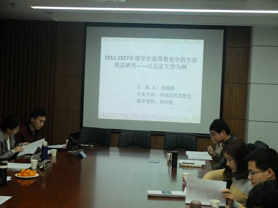 接下来作报告的是中国近现代史专业思想史方向的刘成晓,他以《1912—1927年儒学在高等教育中的生存状态研究——以北京大学为例》做了四十分钟左右的报告。内容涉及清末儒学边缘化和国学热、1912—1927年的北京大学儒学教育、民国高等教育中儒学命运变化的原因等几个部分。刘成晓的报告结束后,与会师生展开了激烈的讨论,除了研究内容之外,大家也对其文章的结构布局、学术规范等提出改进的建议。