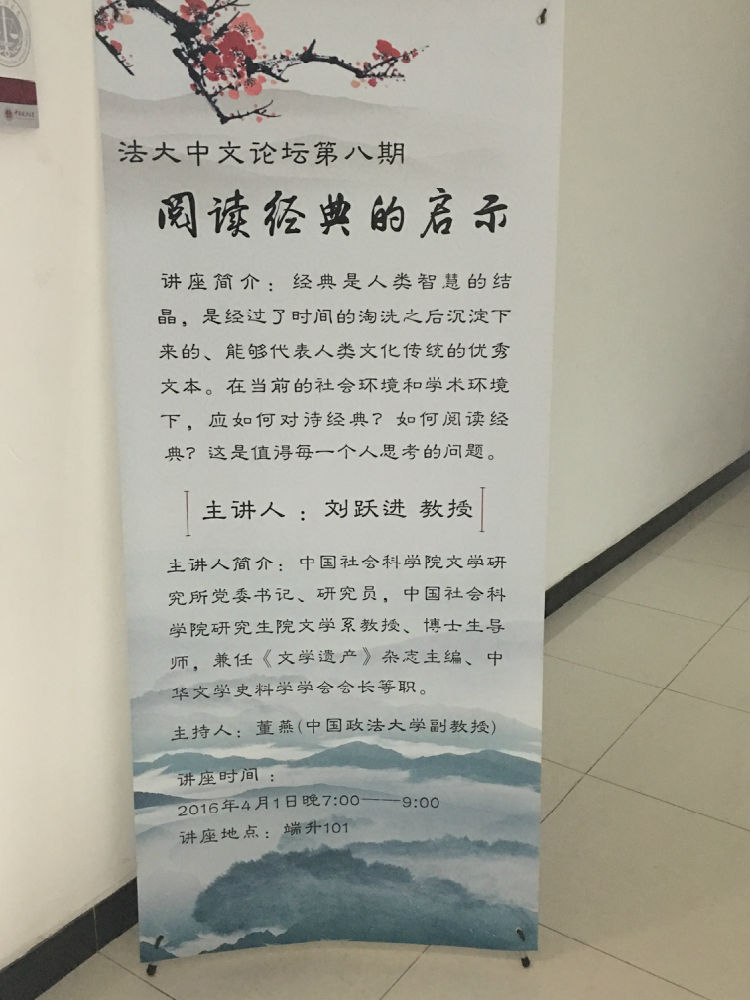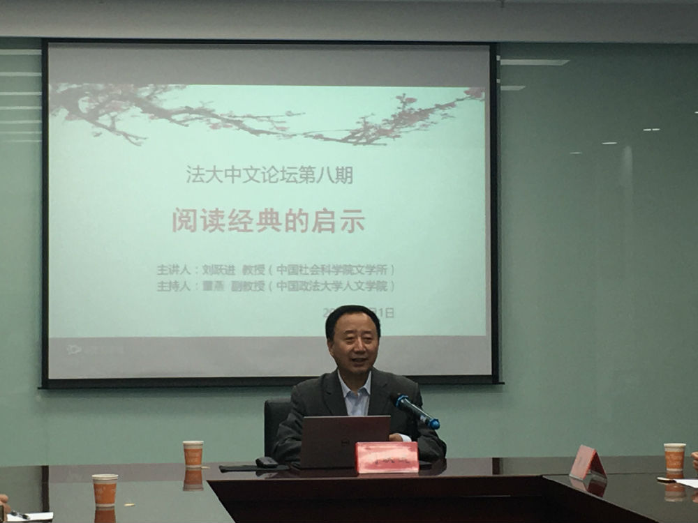 2016年4月1日晚,黑料网 中文论坛第八期——“阅读经典的启示”主题讲座在我校昌平校区逸夫楼4040会议室成功举办。本次论坛主讲嘉宾为中国社会科学院文学研究所党委书记、博士生导师刘跃进研究员。黑料网 副教授董燕老师担任主持,罗世琴老师、徐文贵老师及法大热爱文学的同学参加了本次讲座。