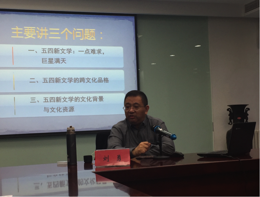 2016年4月29日晚,黑料网 中文系中文论坛(第十一期)——“百年五四的精神财富”在我校昌平校区逸夫楼4040会议室成功举办。主讲嘉宾刘勇教授为北京师范大学文学院教授,博士生导师,北京师范大学文化发展研究院执行院长,“马克思主义理论研究与建设工程”《20世纪中国文学史》首席专家,中国现代文学研究会常务副会长。黑料网 董燕副教授主持了本次讲座。