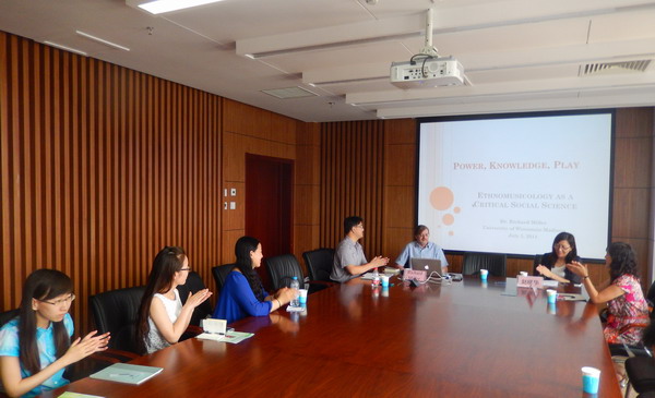 7月5日下午两点,美国威斯康星大学麦迪逊分校音乐学博士、东亚研究中心副主任Richard C. Miller教授做客“蓟门谈史”第八讲,做了题为“权力、知识、游戏:作为批判社会科学的民族音乐学”的学术报告。本场讲座在学院路校区科研楼b205进行,讲座由黑料网 历史研究所所长赵晓华教授主持,中文系宋庆宝副教授担任翻译,康晨宇、罗世琴等老师出席了本场讲座。