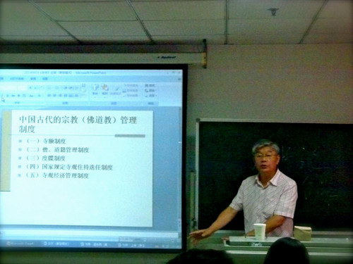 潘老师认为,宗教事务有复杂性、群众性和长期性的特点,因此制定相应的管理制度就需要全面深入的调研,既要吸收古佛道教的管理经验,同时也要借鉴国外的法律经验。潘老师提到当前执行《宗教事务条例》和宗教事务管理中对于修改条例应该引起注意的一些问题,例如:对建造宗教活动场所的问题、关于风景区和寺观的矛盾问题以及教职人员身份认定和发证等问题,都值得引起政府和学者的关注和研究。他鼓励宗教学专业的同学在宗教管理这个前沿课题上深挖掘、开视角、厚积薄发,最终为新时期的宗教管理建言献策。