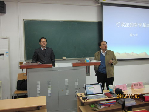 2013年11月5日在教学楼107,商务印书馆副总编辑陈小文先生进行了一场主题为“行政法的哲学基础”的讲座。讲座由文兵院长主持,张灵老师、朱素梅老师及北大法理博士后李璐等老师参加。