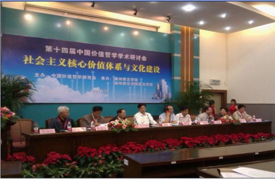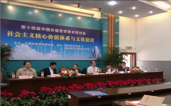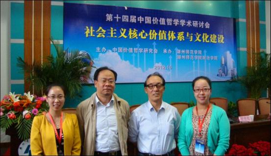 2012年10月13日—14日,第十四届价值哲学学术研讨会在湖州师范学院召开。此次会议由中国价值哲学学会主办,湖州师范学院承办。参加会议的有全国34所高等院校、8所党校和社科院、8个学术杂志的代表共65人。李德顺教授、文兵教授、闫琛老师以及博士生魏燕妮参加了此次研讨会。