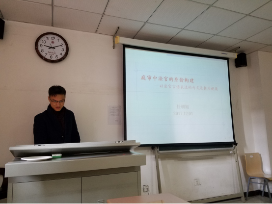 第一位报告人是任朝旭,报告题目是《试论庭审中法官的身份构建——以法官为言语表达的句式选择为视角》。任朝旭同学以对庭审实录的转写为基础,对庭审语句进行分类,统计分析法官、原告、被告或被告人在庭审中的语句使用情况,得出相应的数据。通过分析庭审话语中,法官对陈述句、疑问句和祈使句的使用,表达出相应的不同语气,构建出法官在庭审中的不同身份:倾听者、组织者、引导者、调查者。展示结束后,每一位同学都就报告人的展示内容进行了积极的提问,或是提出自己的建议,任朝旭同学一一作出回应。崔老师与张老师就该报告内容的“问题意识”,以及在庭审实录的语料转写方面,指出报告人研究时的不足之处,并提出了很有价值的指导意见。