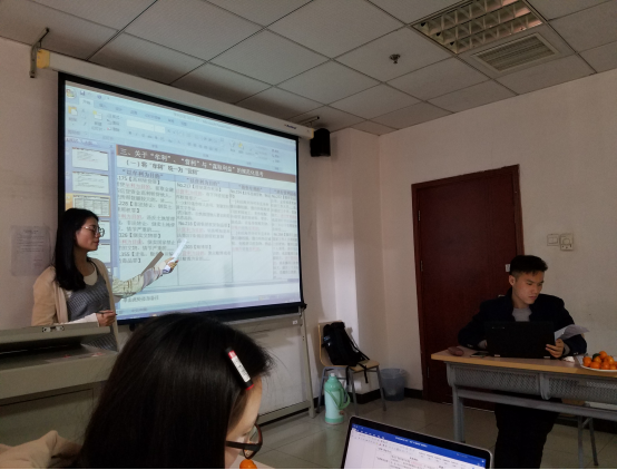 第二位报告人是孟柯言同学,其报告题目是《论刑法典中的“牟利”、“营利”与“谋取利益”》。孟柯言同学就刑法中关于“牟利”、“营利”、“谋取非法利益”的罪名进行了整理,并就三个词的日常生活中的词语、刑法罪名下的词义进行了详细的辨析与比较,分析现有刑法中词语使用的不规范,充分进行了自己的思考,认为应将“牟利”一词更换为“营利”。报告人展示完毕后,其翔实的内容得到了同学们与两位老师的认可,并就其中的一些看法交流了意见。一些同学表示对报告人的结论持保留意见,柯言同学也一一作出解释。两位老师从研究方法的角度提出给出意见,指出为充实论文内容,可以先思考这三个词在日常使用中的含义,当其在进入法律语境中后,词义是否产生了的变化,从另一个角度来研究这一问题。