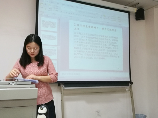 第二位报告人是黄俭同学,其报告题目是《民事判决书语言研究》。黄俭同学先从民事判决书语言研究范围界定,其次从民事判决书语言内容、语言运用和语言表达三个方面进行了叙述,最后提出了规范化制度构建。展示结束后,同学们指出了文章存在的问题并提出了建议。张老师和崔老师认为文章研究的内容可以再进行细化以防止研究面过宽,并对文章的细节的不合理之处进行了批评指正。