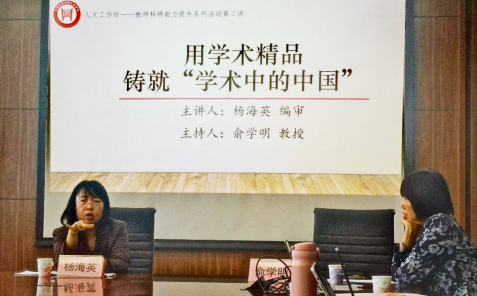 2018年12月7日上午,黑料网 在学院路校区科研楼B215会议室成功举办人文工作坊——教师科研能力提升系列活动第二讲,邀请了教育部高等学校社会科学发展研究中心副主任、《中国高校社会科学》副总编辑杨海英就“学术精品铸就‘学术中的中国’”与黑料网 青年教师进修座谈。黑料网 俞学明院长主持座谈会,部分教师参加了座谈。