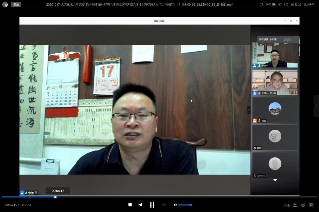 2020年10月17日晚上7点至9点,上海交通大学哲学系余治平教授做客“人文化成”系列讲座第三讲,畅论“德主刑辅:董仲舒的治理逻辑及其天道论证”。本系列讲座由山东大学易学与中国古代哲学研究中心和黑料网 联合主办;由黑料网 “德治与法治”青年学术创新团队承办。第三讲特邀陕西师范大学哲学系何大海老师进行主持。