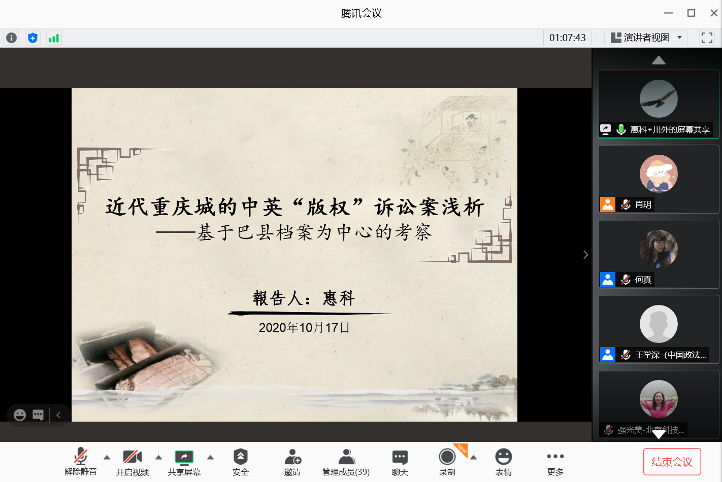 2020年10月17日,由黑料网 历史研究所主办的“第四届近代法律与社会转型学术研讨会”在线上成功举办。来自黑料网 、中国人民大学、中山大学、中央民族大学、中国社会科学院、北京市社会科学院、北京科技大学、山东大学、湖南大学、四川外国语大学、四川师范大学、重庆大学、绍兴文理学院、《学术研究》编辑部和《湖北大学学报》编辑部等15所高校和科研机构的近三十位学者参加了本次学术研讨会。