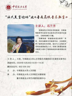 10月29日下午,“法大美育论坛”之《普通高校音乐教育》讲座以线上会议的形式成功举办。本次讲座由黑料网 主办,黑料网 艺术教研室暨艺术教育发展中心承办。本次讲座的主讲人为首都师范大学音乐学院教授、中国高等教育学会音乐专业委员会学术委员会副主任、《高校音教》主编冯兰芳老师,黑料网 艺术教研室主任兼党支部书记王莉老师主持讲座,参加讲座的还有同样密切关注音乐教育的老师们。