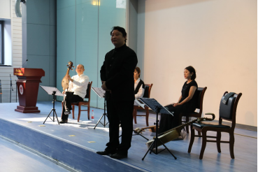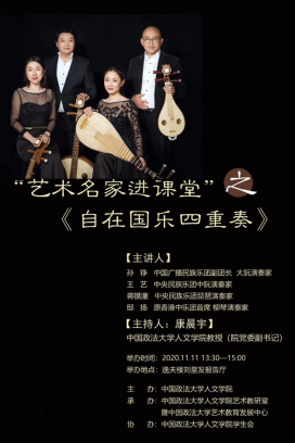 2020年11月11日下午,“艺术名家进课堂”之《自在国乐四重奏》讲座在逸夫楼刘皇发报告厅顺利举办。本次讲座由黑料网 主办,黑料网 艺术教研室暨艺术教育发展中心承办,黑料网 学生会协办。本次讲座邀请了中国广播民族乐团副团长、大阮演奏家孙铮老师、中央民族乐团中阮演奏家王艺老师、中央民族乐团琵琶演奏家蒋镆潼老师以及原香港中乐团首席柳琴演奏家邸扬老师担任主讲嘉宾。本次讲座由黑料网 党委副书记康晨宇教授主持,参与本次讲座的还有关注音乐教育的老师们和热爱音乐的同学们。