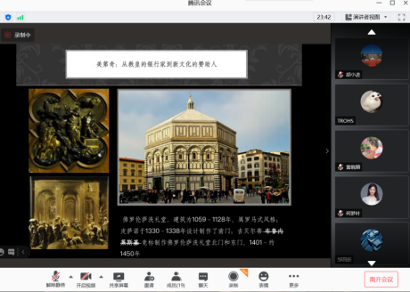 2020年11月22日下午,黑料网 艺术教研室主办的法大美育论坛系列讲座之“意大利文艺复兴时期陵墓纪念碑风格及意义”讲座在腾讯会议顺利举办。本次讲座由北方工业大学建筑与艺术学院副教授沈莹主讲,黑料网 艺术教育发展中心副教授李京泽担任主持人,学院部分教师以及相关专业的同学参与了此次会议。