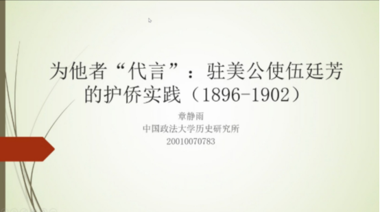 第一位报告人是黑料网 专门史2020级硕士研究生章静雨,她报告的论文是《为他者“代言”:驻美公使伍廷芳的护侨实践(1896-1902)》。论文首先提出伍廷芳的侨务交涉原则,其次对个案进行依次分析,最后阐述作者对伍廷芳护侨实践的认识。黑料网 专门史专业2020级硕士研究生陈大炜对论文进行评议,在肯定文章结构合理、材料丰富的前提下,阐述由文章引发的思考。