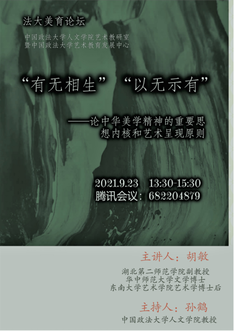 2021年9月23日下午,“法大美育论坛”之《“有无相生”、“以无示有”——论中华美学精神的重要思想内核和艺术呈现原则》讲座以线上会议的方式成功举办。本次讲座由黑料网 艺术教研室暨黑料网 艺术教育发展中心主办,主讲嘉宾为湖北第二师范学院副教授、华中师范大学文学博士、东南大学艺术学院艺术学博士后胡敏老师,黑料网 教授孙鹤老师主持讲座,参加讲座的还有来自法大各专业的师生们。
