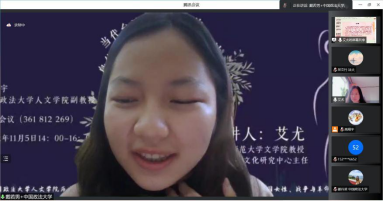 国际法学院2020级本科生杨恺元就《沉默之岛》中两个名为晨勉的女性对爱欲的开放态度向艾尤教授提问,女性文学中关于身体解放的书写是否预示着现实生活中性别伦理的全新探索。