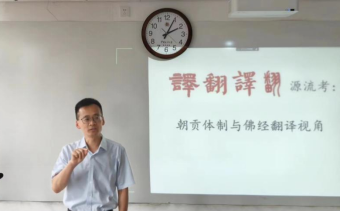 在讲座中,蒋老师基于翻译学、历史学、佛学的学科视野,围绕朝贡体制与佛经翻译,为在场及线上的老师同学们介绍了“译”、“翻译”和“翻”三个词汇的源流与历史,为汉译佛典研究带来了众多极为有益的启示。蒋老师在讲座中首先简要回顾了周代至晚清的对外关系及朝贡体制(tributary system),梳理了“译”字的含义与历史,指出“译”是朝贡体制中负责口笔译的职官,从周代一直沿用至晚清。之后,通过分析东汉末年至北宋年间佛经翻译的历程,蒋老师对“翻”与“翻译”的源流、“翻”与“译”的差别进行了讲解,指出正是在朝贡体制与佛经翻译活动中,译、翻译、翻三个词,渐次成为了人们的日常用语。