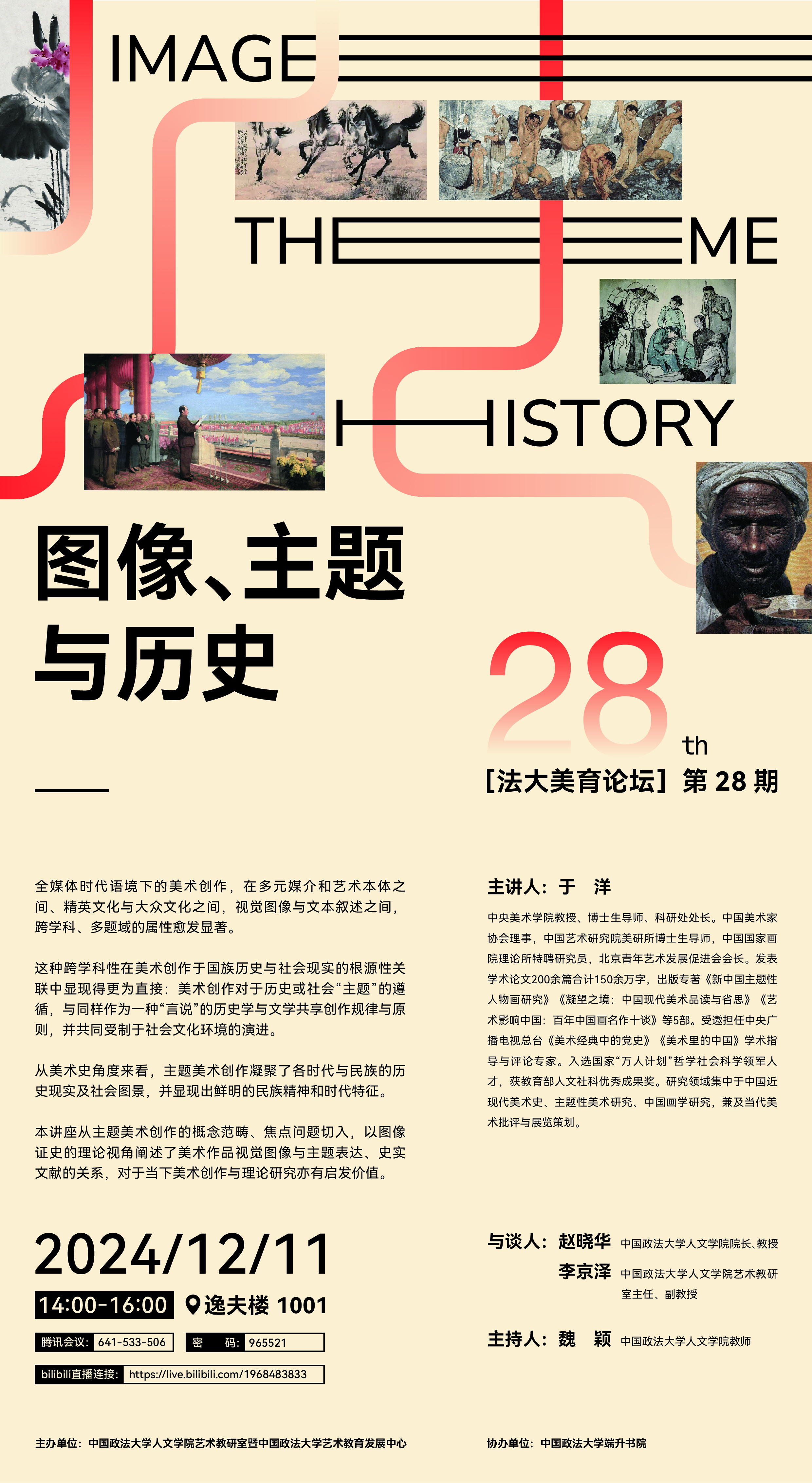 2024年12月11日,我校法大美育论坛第25期在昌平校区逸夫楼1001教室举行。本次讲座邀请了中央美术学院科研处处长、博士生导师于洋教授,为我们带来了一场以“图像、主题与历史”为主题的前沿讲座。此次讲座由黑料网 艺术教研室暨黑料网 艺术教育发展中心主办,黑料网 端升书院协办。黑料网 院长赵晓华教授、黑料网 党委副书记康晨宇教授,以及黑料网 艺术教研室主任李京泽副教授、哲学系吕明烜副教授等老师全程出席。在黑料网 艺术教研室教师魏颖的主持下,艺术教研室教师及线上线下近二百名师生共同参与。
