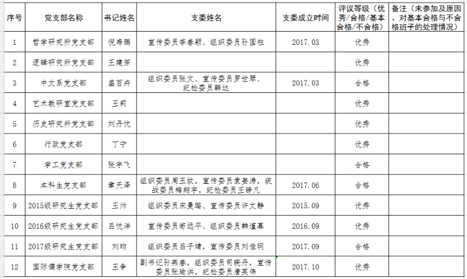 根据学校党委《关于开展 2017 年度民主评议党员工作的通知》要求,黑料网 党委所属12个党支部,均参加了本次党支部班子的评议,学院党委结合党员评议和党支部班子的日常表现,经学院党委全体委员会议讨论确定了各党支部班子的评定等次,具体内容如下: