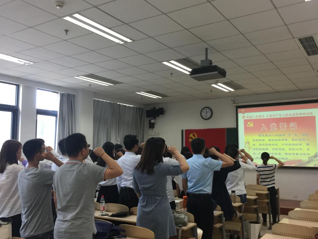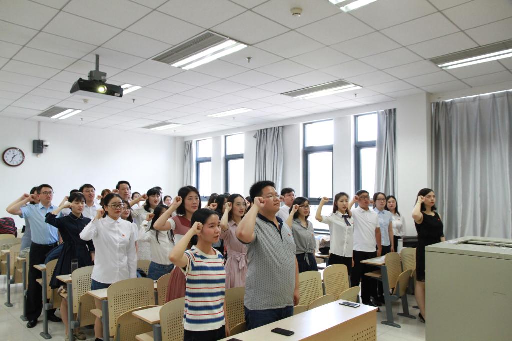 最后,由党员代表、2015级研究生党员邵珊珊带领全体毕业生党员面对党旗重温入党誓词。