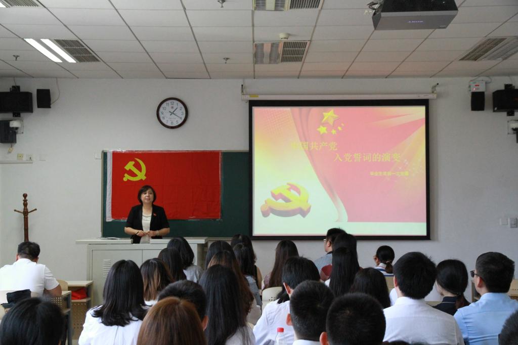 2018年6月14日,黑料网 分党委书记兼副院长杨军老师在昌平校区逸夫楼1003为黑料网 全体本科生和研究生毕业生党员讲了在校期间“最后一次党课”。杨军老师为大家讲解了中国共产党入党誓词的不同演变阶段。