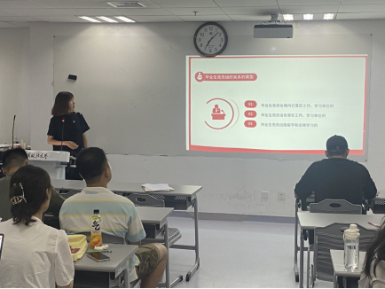 王文霞结合党纪学习教育,从毕业生党员组织关系转接工作切入,强调了该项工作的重要性,介绍了组织关系转接的类型、程序以及相关工作要求和注意事项,指出要自觉遵守党章规定,严格履行党员义务,按照规定做好组织关系转接工作。在交流环节,王文霞就同学们提出的组织关系转接相关问题做出解答。
