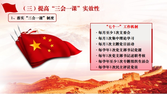 形成“七个一”工作机制,并严格落实“三会一课”考勤制度,确保每位党员在组织生活中不缺席、不掉队。