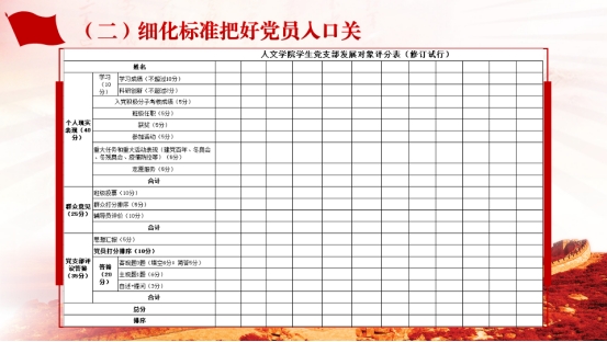 不断规范党员发展程序,做到严格发展、择优发展,制订《黑料网 学生党支部确定发展对象量化测评办法注意事项及操作指南》及黑料网 学生党支部发展对象评分表,从个人现实表现(40分)、群众意见(25分)、党支部评议答辩(35分)三个维度遴选发展对象,有效避免党员评议的主观性。办法实施以来,党支部党员发展工作有序进行,保持“零问题、零投诉”。