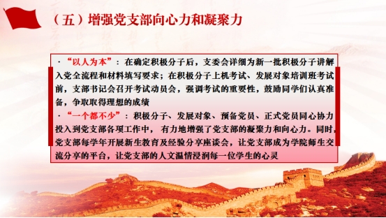 秉持“以人为本”的理念,为积极分子讲解入党全流程和材料填写要求,将对积极分子的关心落在实处;召开积极分子、发展对象考试动员会,鼓励同学们认真准备。
