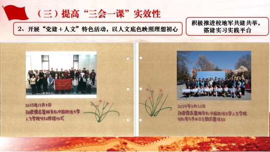 以学院人文底蕴为依托,开展“党建+人文”特色活动。多次承办党史知识竞赛,“回首百年路,启航新征程”线上重走长征路活动。积极推进校地军共建共举,搭建实习实践平台,与武警北京总队中央党校警卫连(张思德中队)张思德精神宣讲团开展共建活动。共建成果促成黑料网 张思德志愿服务队的成立,支部成员积极活跃于其中。组织支部成员前往党史展览馆、李大钊故居等红色教育基地学习实践,不断建设“以文化人、以文培元”的人文特色党支部。