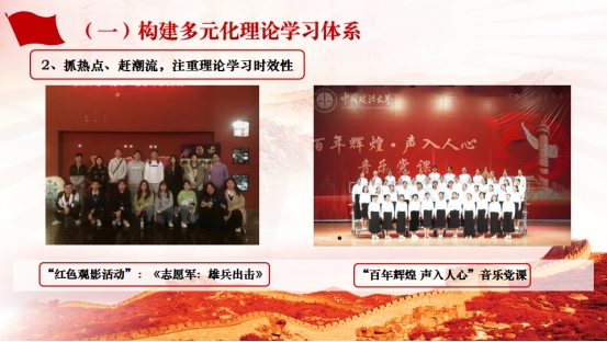 以时政热点、社会新闻、文艺风向为出发点,不定期举办红色观影活动,举办音乐党课,将音乐艺术与党史教育有机融合,成果在学校“百年辉煌 声入人心”音乐党课中展示。