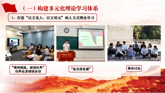 开展“博闻慎思,研读经典”经典论著研读活动,“党员讲党课”理论学习活动,不断打造“以文化人、以文培元”的人文式理论学习。