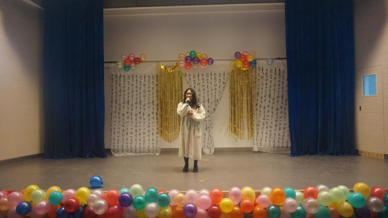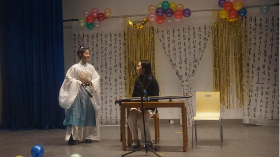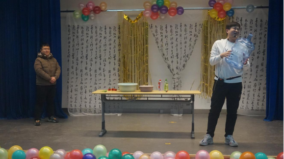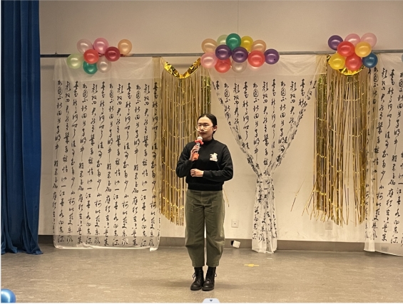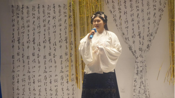 在第一小节的中场时间内,大家进行了紧张激烈的“谁是卧底”小游戏和大家期待已久的抽奖环节。稍事休息后,邓陈同学用美妙的嗓音,以一首大家耳熟能详的英文歌曲《Can’t take my eyes off you》作为第二小节的开始,用舒缓婉转的曲调引领大家回到精彩的节目表演中来。接下来,是路若菡同学为大家献上的一首中国古典音乐《三千叠阳关》,用悠扬动听的古琴,为大家再现了一场高山流水般与先贤相会的奇幻梦境。紧接着,是孙依阳同学带来的评剧《乾坤带》,用极具特色的戏腔,声情并茂地为我们讲述了“秦英闯下杀身祸,戴罪立功征西凉”唐朝一代忠良的感人故事。后面,是武超月、谢丽琼等同学为我们带来的《欢乐被套舞》,用滑稽欢乐的无厘头表演,引得在座的各位观众笑声不断。最后,是夏晨雨同学带来的一首古风歌曲《霜雪千年》,用悠远轻灵的嗓音,绘出一幅古色古韵的美丽画卷。