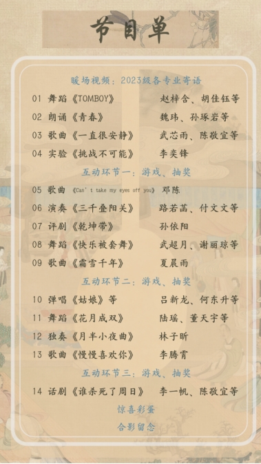 在每个小节演出完毕之后的中场时间还有全场观众都能参与的趣味性小游戏和紧张刺激的抽奖环节,本次晚会演出的节目单如下: