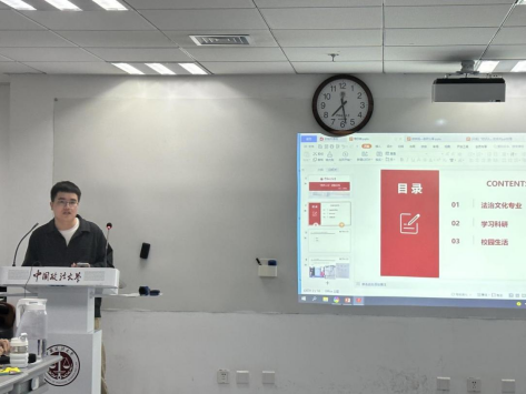 随后发言的是2021法治文化专业的穆云航同学。他首先介绍了自己对于法治文化这一交叉学科的理解,并鼓励同学们积极与学院内不同背景的老师们交流学习。他还建议同学们借助学校的平台和资源积极参与各项活动,并围绕自己的学习和科研经历进行了介绍和分享,为同学们开阔了视野。